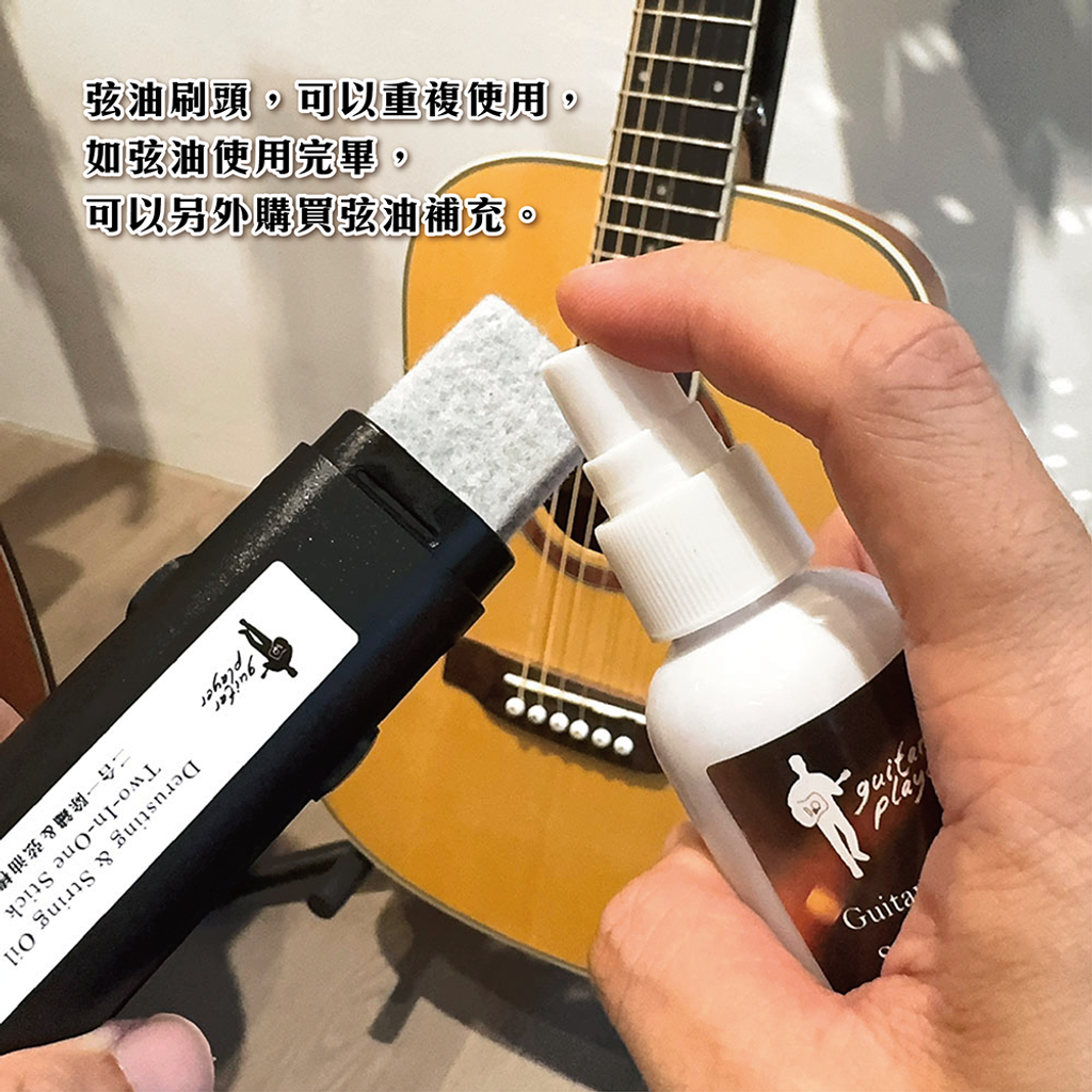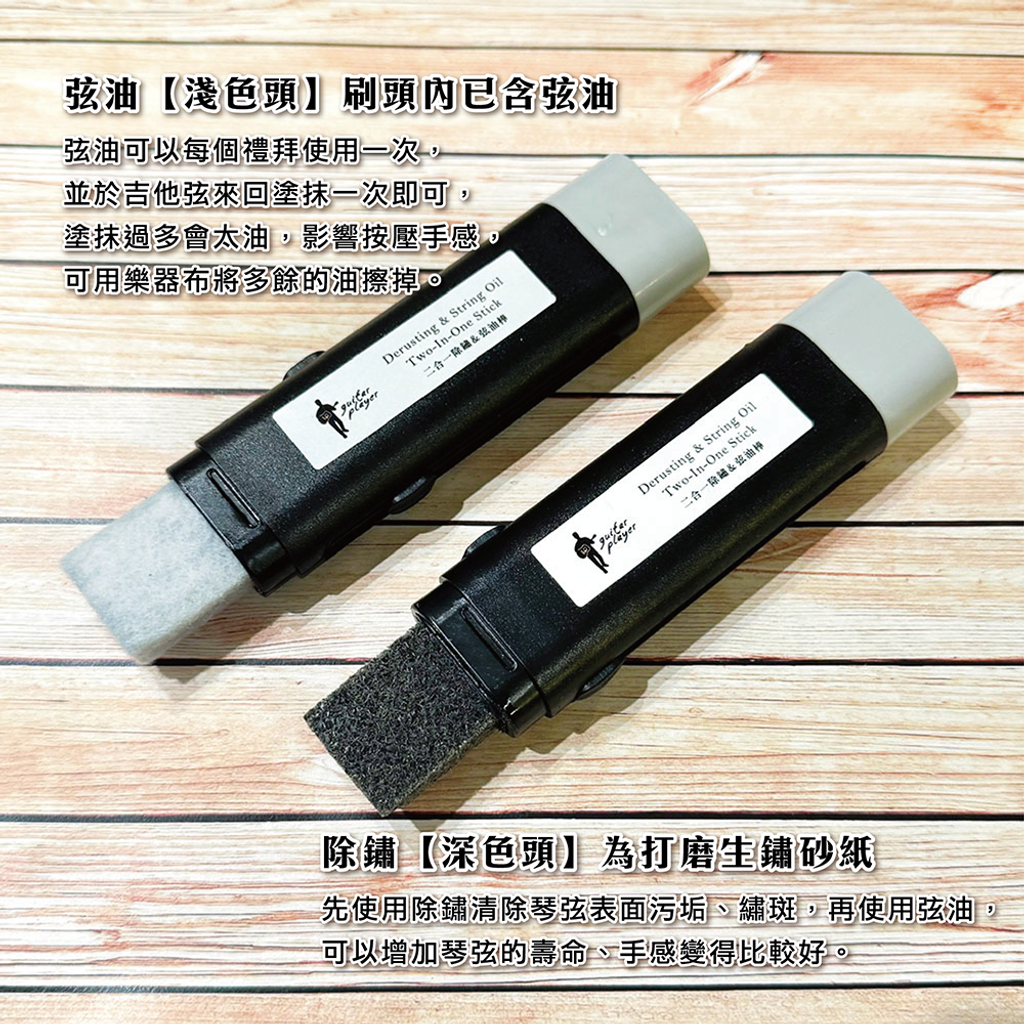 白色刷頭內含弦油,適用於民謠吉他、電吉他等...金屬弦上,塗上弦油,可以使金屬弦阻絕空氣,延緩弦生鏽,使金屬弦壽命更長、彈奏更順手。建議每一個禮拜在弦上來回塗一次即可,若塗太多會使吉他弦太油影響彈奏,黑色刷頭為打磨砂紙,可以清除琴弦表面污垢、繡斑,使用後可以增加琴弦的壽命、彈奏手感更好。
